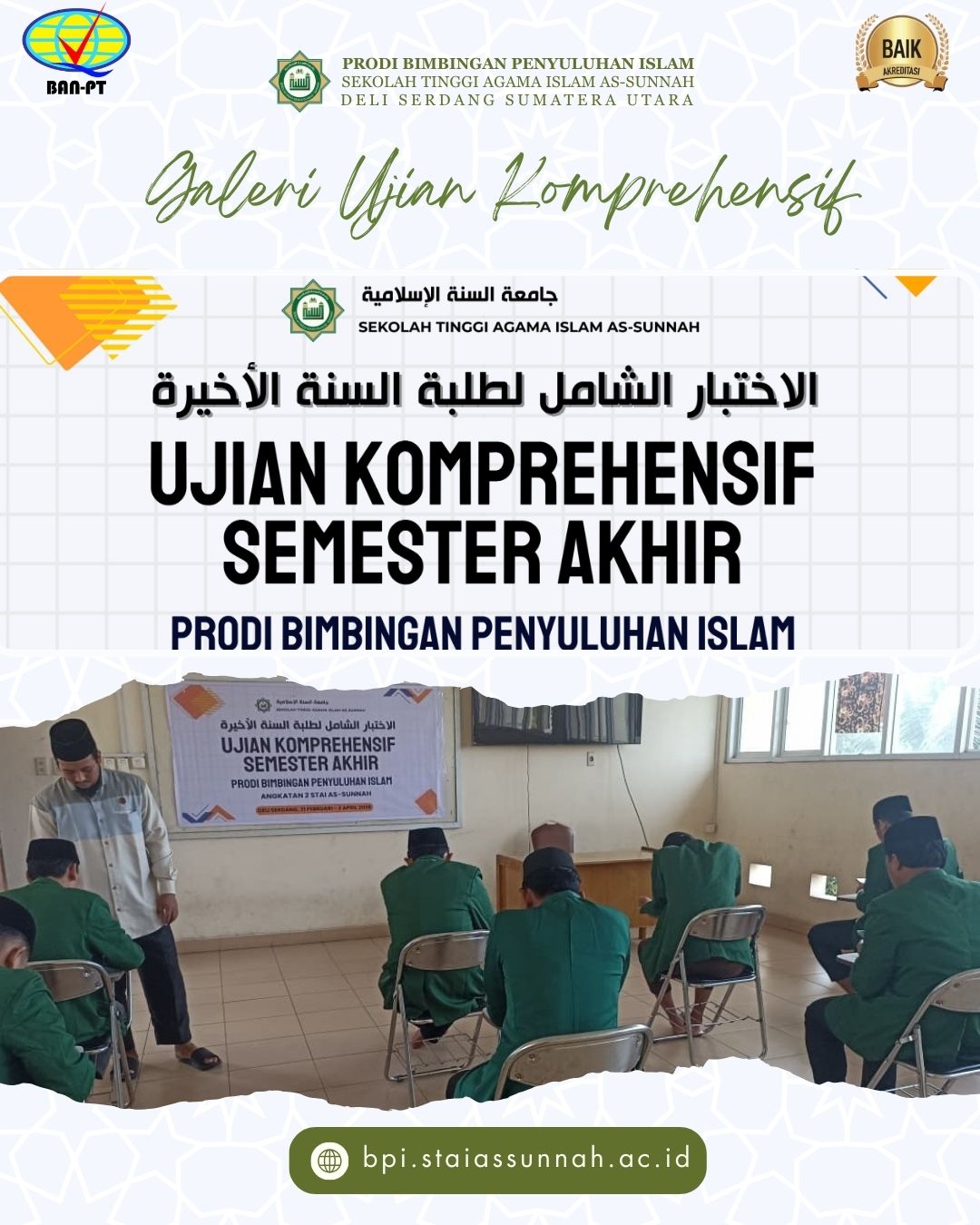 Program Studi Bimbingan Penyuluhan Islam (BPI) STAI As-Sunnah Deli Serdang tengah melaksanakan Ujian Komprehensif sebagai salah satu tahapan akademik penting bagi mahasiswa tingkat akhir. Kegiatan ini menjadi bagian dari proses evaluasi menyeluruh terhadap capaian pembelajaran mahasiswa sebelum memasuki tahap penyusunan dan ujian skripsi.